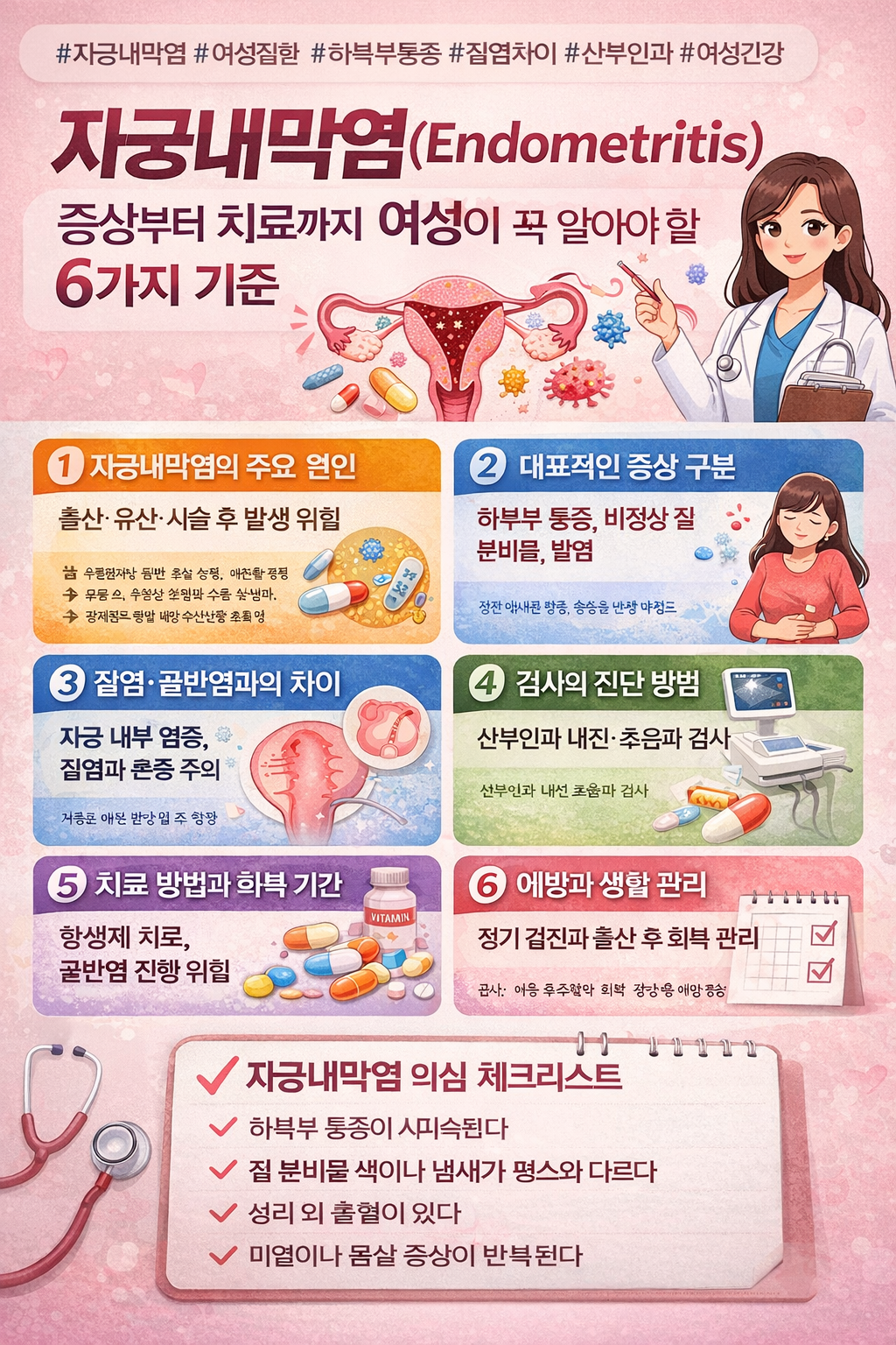 아래에서는 자궁내막염을 이해하는 데 꼭 필요한 내용을 6가지 기준으로 정리했습니다.